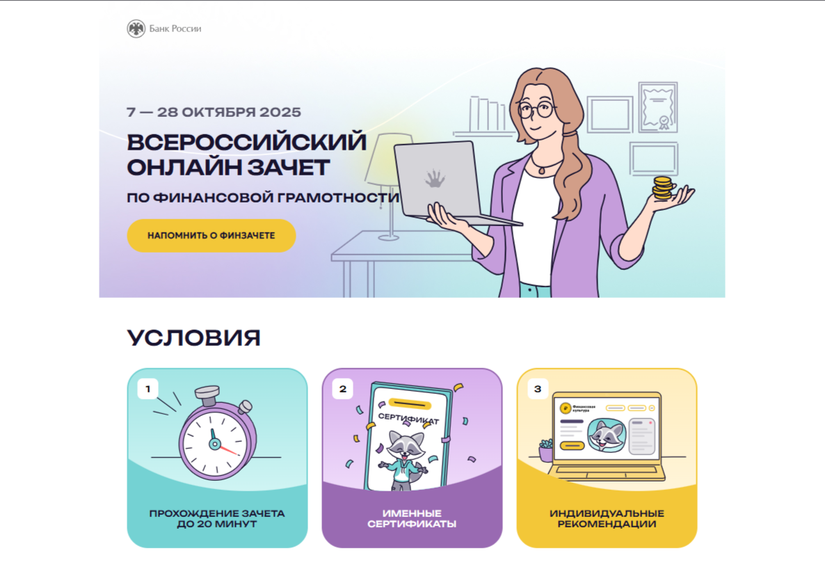 Банк России информирует о проведении с 7 по 28 октября 2025 года VIII Всероссийского онлайн-зачета по финансовой грамотности для всех категорий населения.