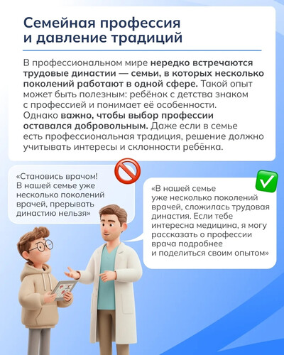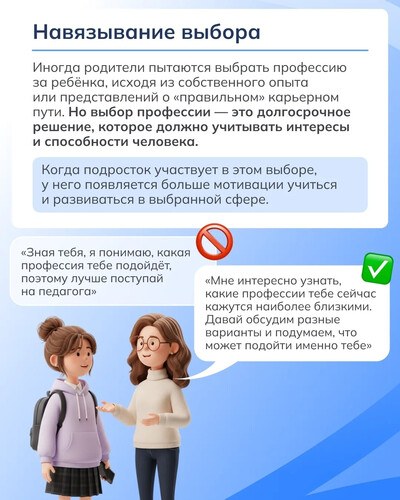 Выбор профессии — важный этап в жизни любого человека, и поддержка родителей играет большую роль. Именно близкие чаще всего стремятся помочь и поддержать в выборе. Однако даже добрые советы могут звучать слишком категорично и вызывать сопротивление.